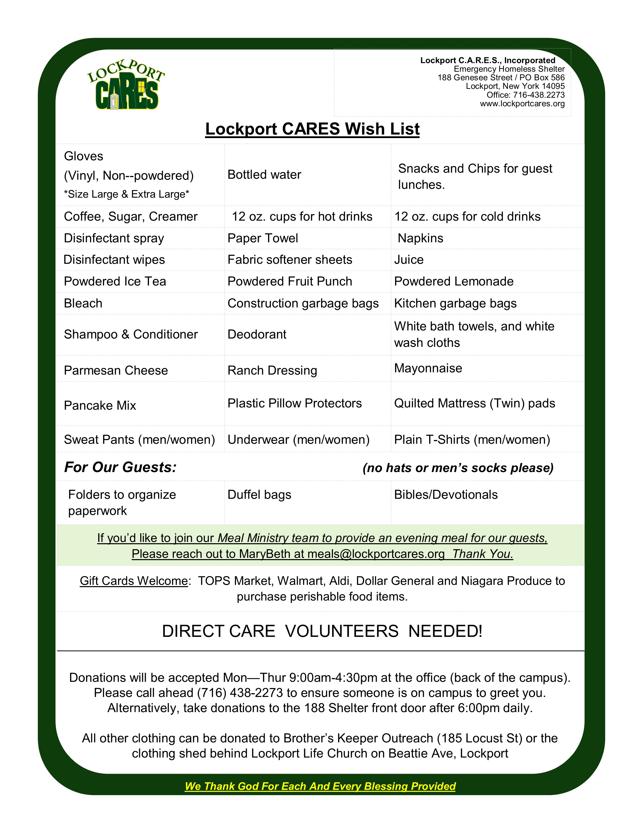 You can donate items from our WISH LIST (click here) and deliver them to Lockport CARES Campus Office at 188-192 Genesee Street, Lockport between 9:00am-4:30pm Monday to Thursday OR, any time after 6:00pm at the 188 Shelter.